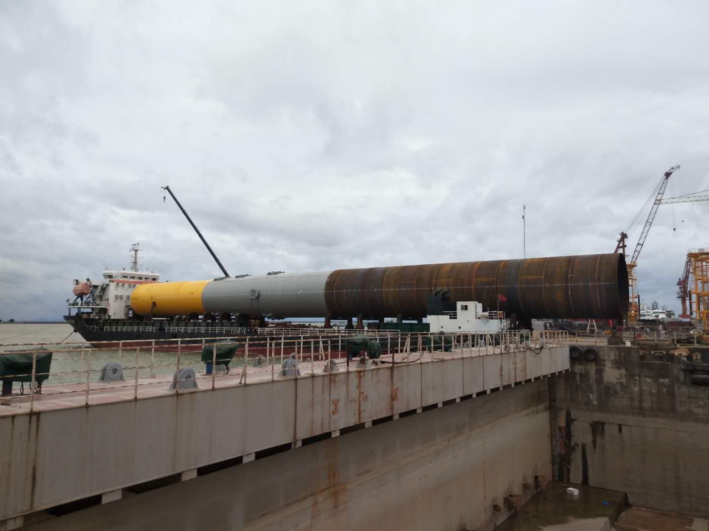 7月15日凌晨兩點多,歷經(jīng)1小時50分鐘的滾裝,中廣核后湖單樁項目首套單樁--77#樁的裝船作業(yè)于4點15分順利完成,完工在600T吊機底下靜候裝運20多天的第二套73#樁也于7月25日上午11點左右完成裝船交付,標志著中廣核后湖單樁項目首批單樁的生產交付任務全部完成!