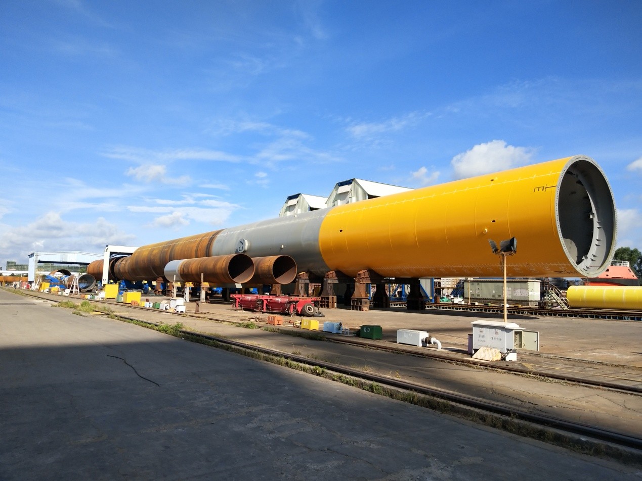 據(jù)了解,中廣核后湖單樁的77#樁總長91.87米、口徑8米、重達1339噸;17#樁總長101.3米、口徑8.4米、重量1517噸,其長度、重量規(guī)格在已交付的單樁中位列第二。從下料卷板、焊圓、拼段、涂裝到外場總組完成,生產一套樁用時20多天。期間,后湖單樁的總組還經(jīng)歷了“龍舟水”和初夏高溫天氣的洗禮,給施工人員帶來很大考驗。面對種種困難,項目人員沒有退縮,想方設法積極應對,努力搶節(jié)點,推進制造任務按質按期完成,確保給業(yè)主方交付合格優(yōu)質的單樁產品,為后續(xù)業(yè)務承接夯實有利基礎。