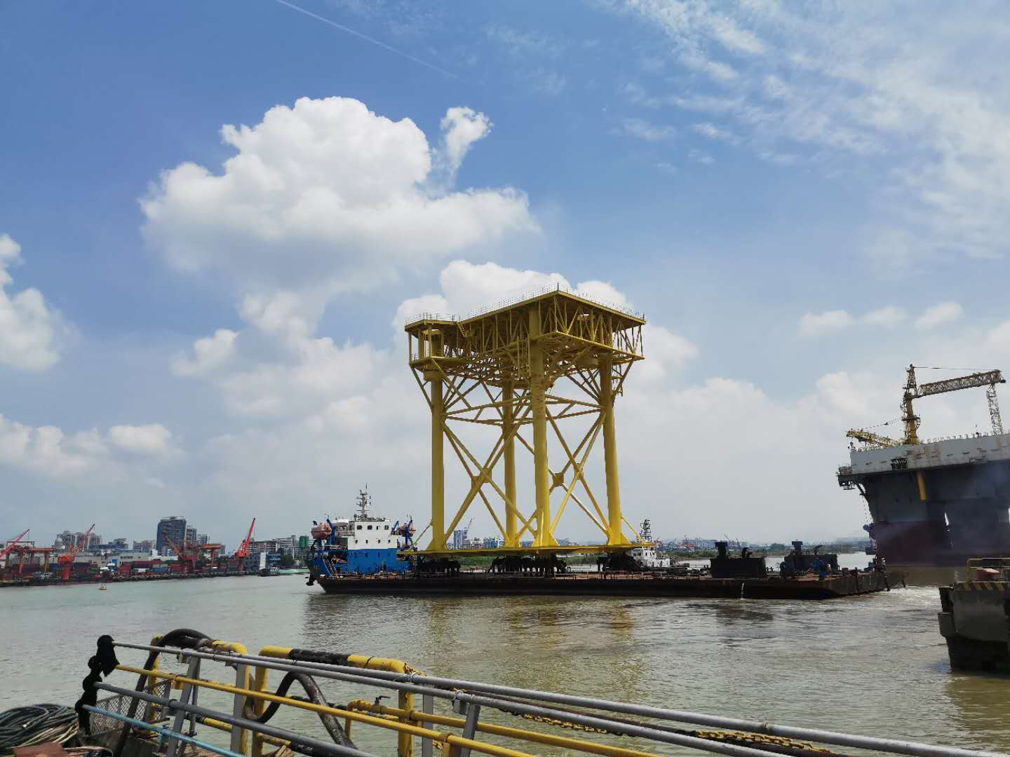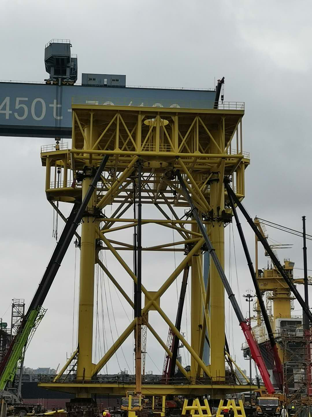 在制作過程中,由于雨水和高溫天氣嚴重影響到整個工程制作進度,為了保證工程節(jié)點進度能夠按照業(yè)主指定時間完工交付,項目組成員在保證質量安全的前提下,不懼風雨和炎日暴曬,24小時通宵加班,最高峰是采用11臺起重設備進行作業(yè)來保證整個項目進度,最終順利按照業(yè)主的節(jié)點要求完成交付,體現(xiàn)了重工人的責任擔當和在困難面前勇往直前的精神。
